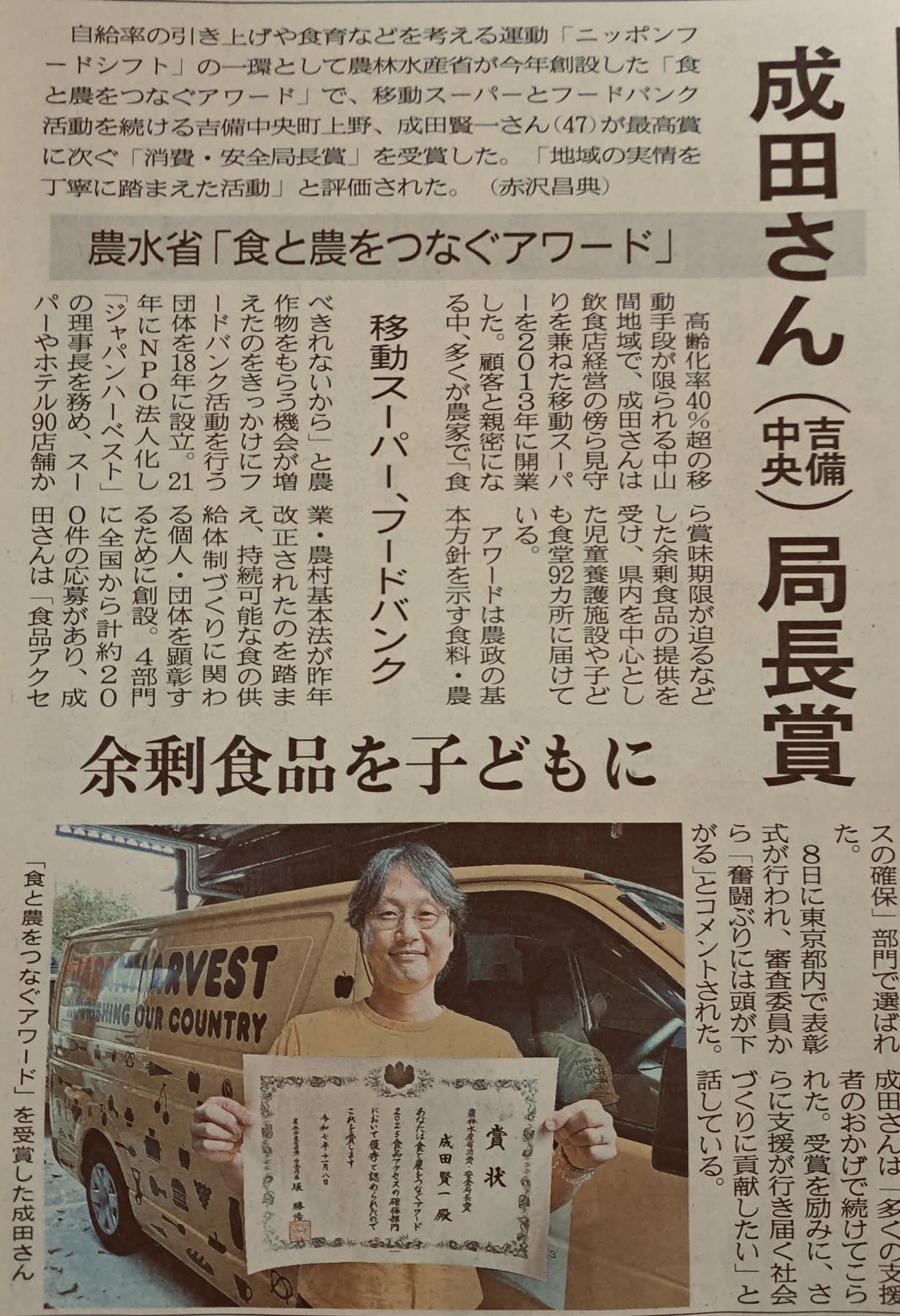 自給率の引き上げや食育などを考える運動「ニッポンフードシフト」の一環として農林水産省が今年創設した「食と農をつなぐアワード」で、移動スーパーとフードバンク活動を続ける吉備中央町上野、成田賢一さん(47)が最高賞に次ぐ「消費・安全局長賞」を受賞した。「地域の実情を丁寧に踏まえた活動」と評価された。